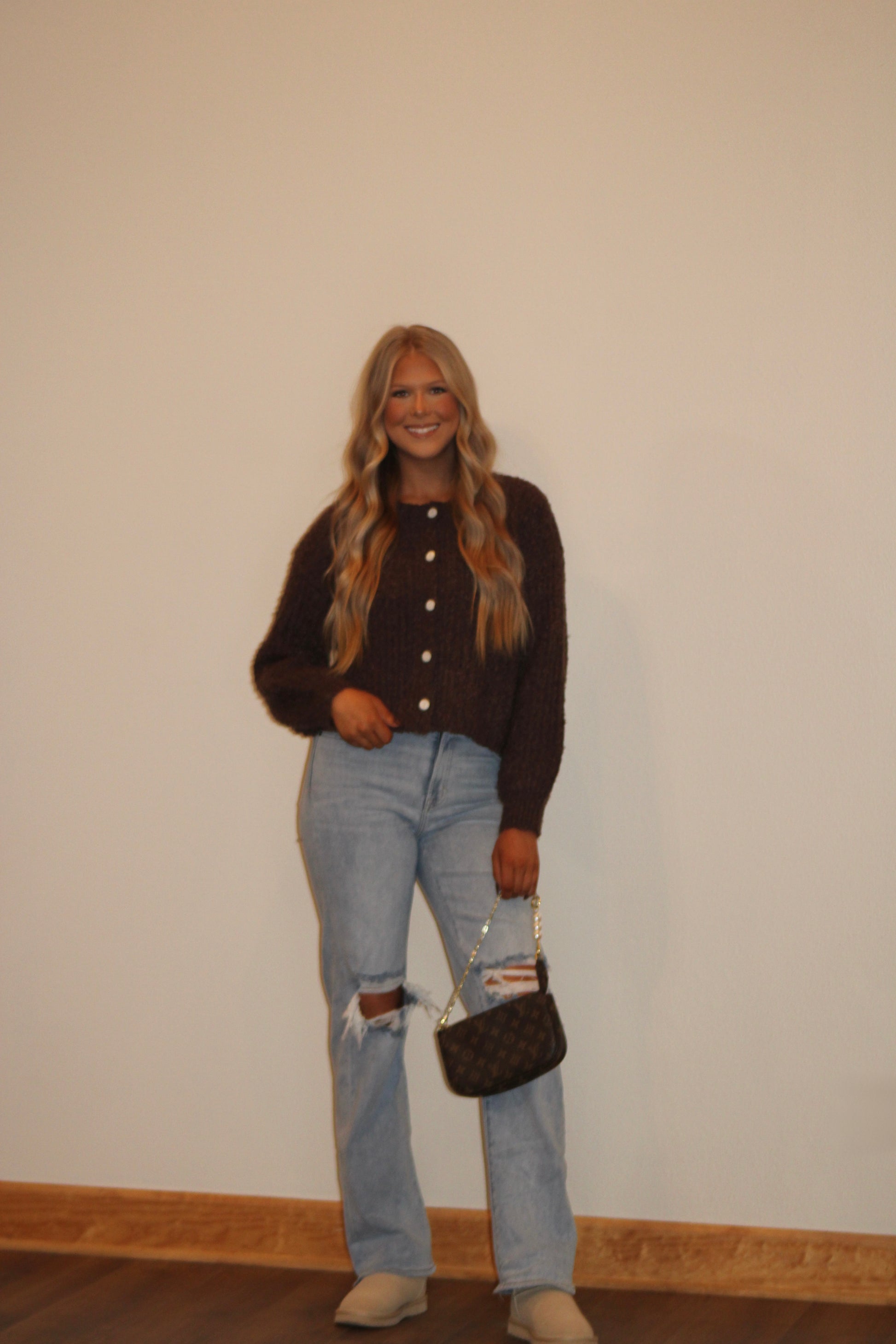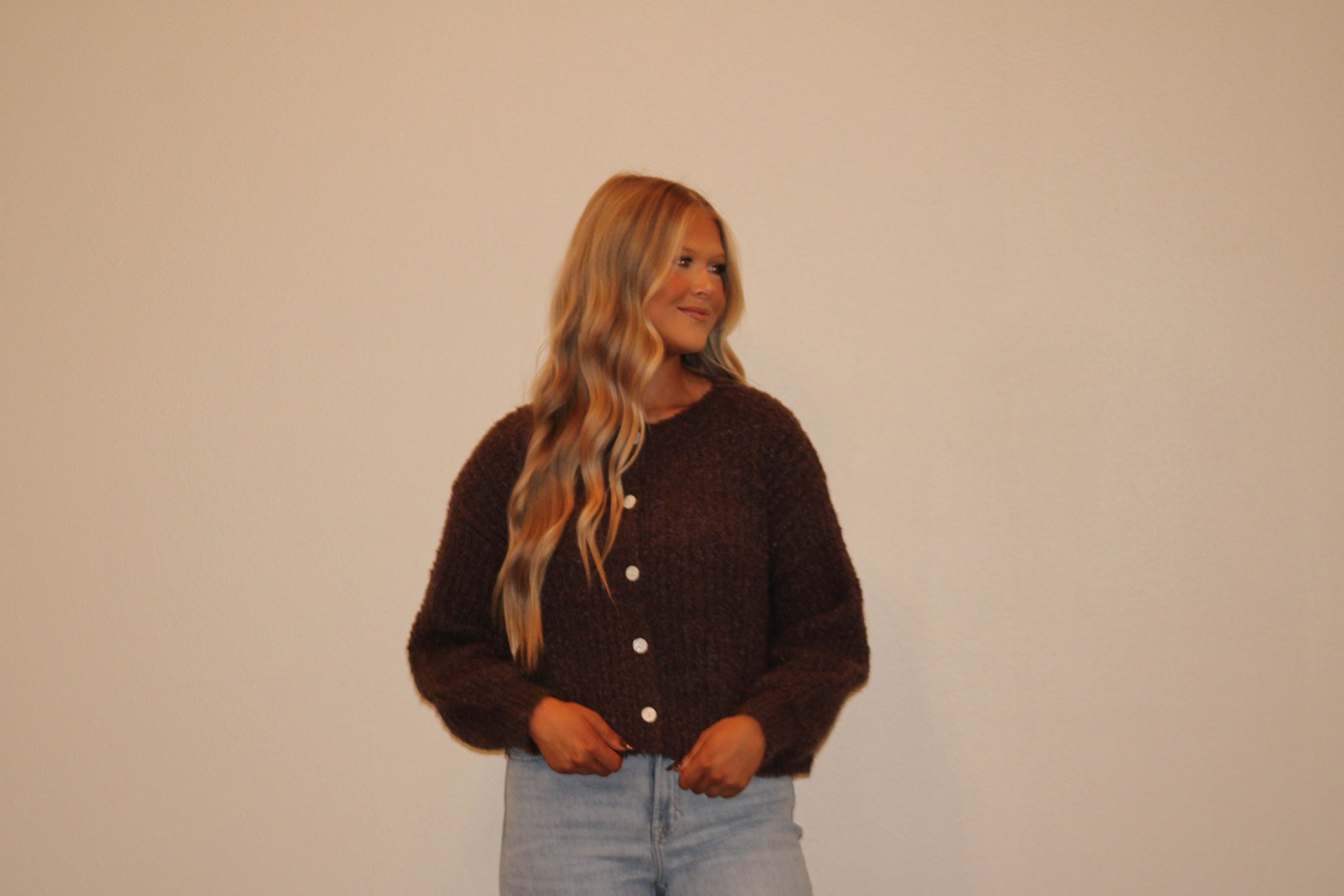 Details: This sweater fits true to size. This sweater features functioning buttons down the front. This sweater is so soft and cozy. This sweater is lightweight but will keep you warm. This is a dark chocolate brown color.